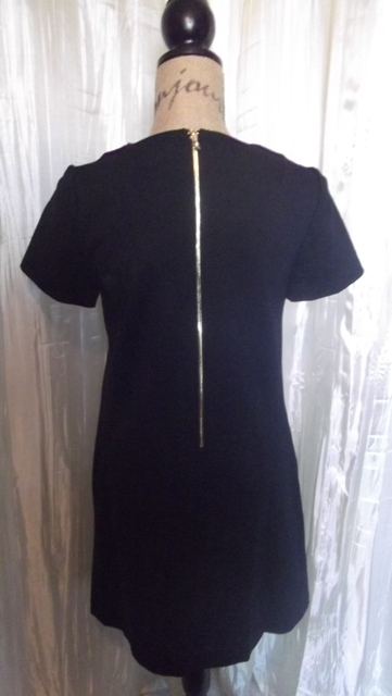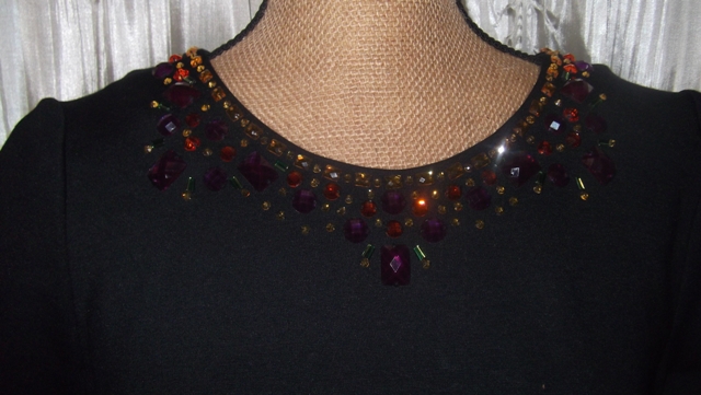 Features multicolored jewels along neckline, two side pockets, and gold exposed zipper up back of dress.