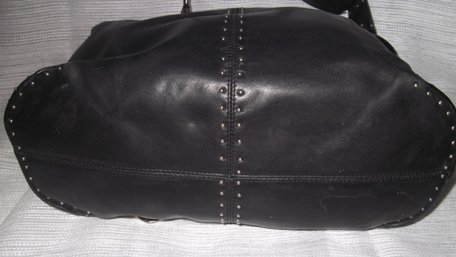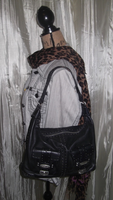 Michael Kors grommet bag with silver hardware. Features one main compartment, one inside zipper pocket, and two front pockets. Coated in black leather with silver grommets. Absolutely the cutest little bag for everyday wear.